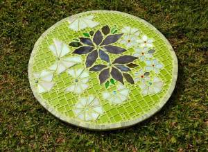 DESCRIÇÃO: Tampo de mesa em placa cimentícia, mosaico floral em vidro fundido (fusing) e pastilha de vidro cristal. 2017. A estrutura pode ser adquirida separadamente em ferro ou fibra, na cor e altura a escolher.